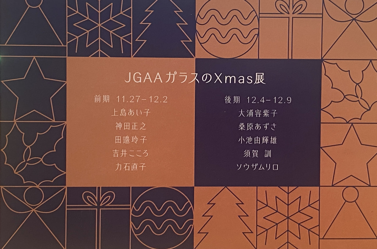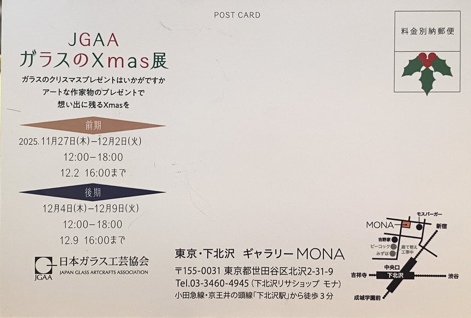 2025年11月29日 NEWSEVENT 12/3〜9日 JGAA『ガラスのXmas 展』東京・下北沢 ギャラリーMONA 今年も出展致します!クリスマスをテーマにステンドグラスやガラスアクセサリーの販売を致します! 是非 お待ちしております。